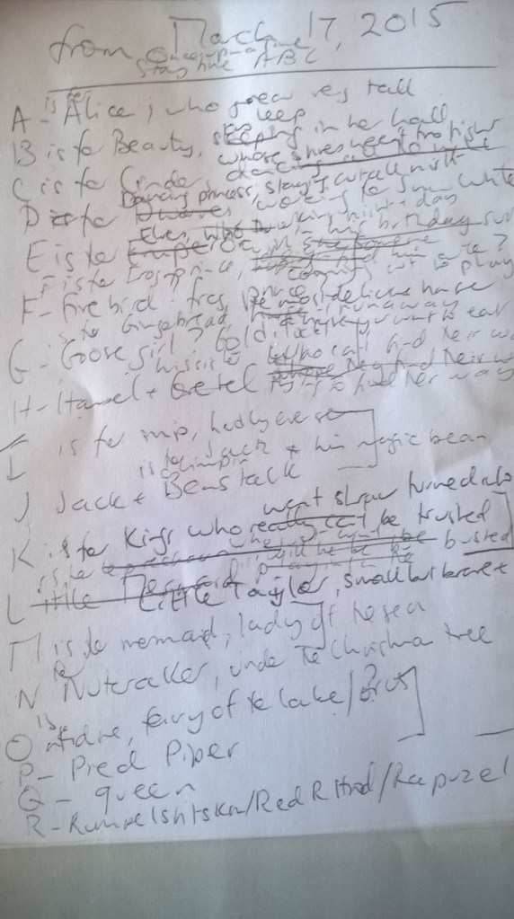 So–the first glimmer came on a car trip to Sydney in March 2015–I was, I hasten to reassure you, the passenger, not the driver–when I suddenly thought of a great idea: what about an ABC book featuring characters from fairy tale, folk tale and legend? Now anyone who knows me knows I love my traditional tales, but you may not know I also love ABC books, when they’re clever..my favourite being Colin Mc Naughton’s hilarious, brilliant ABC and Things, published in the 90’s. What fun, I thought, and as I always travel with a notebook, out it came and I started scribbling down a few ideas for each letter, as well as a working title, Once upon a Time/Storytime ABC… Below is what that first handwritten draft looks like: