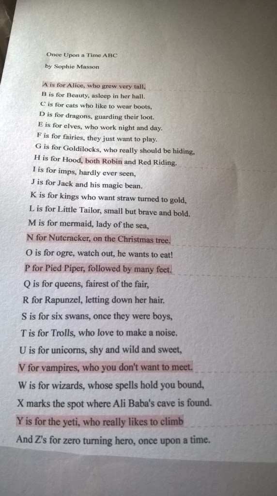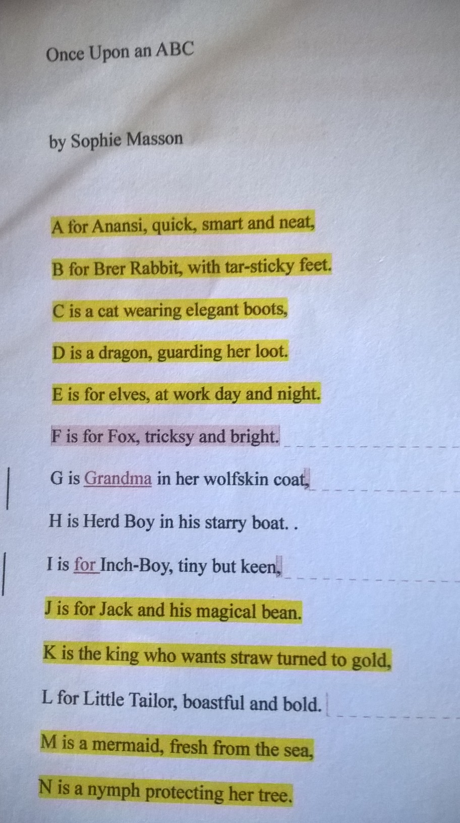 As you can see, it was still embryonic, with a few letters missing and a long way from the final text. But when I got back home, I edited the scribbles, added bits, subtracted others, tweaked the title to ‘Once Upon a Time ABC’, then typed everything up, and here’s the result of that: