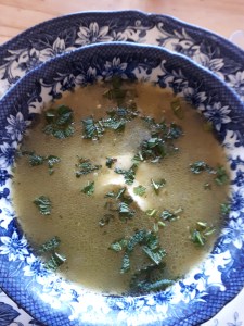 Version 1:  Ingredients: 1 large cucumber, 1 large potato, garlic, onions, handful herbs-I used mint, thyme and tarragon—salt, pepper, stock(vegetable or chicken, depending on your preference), butter or sunflower oil.