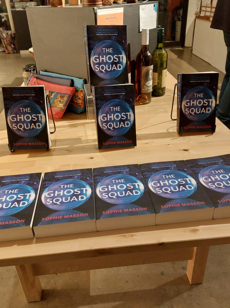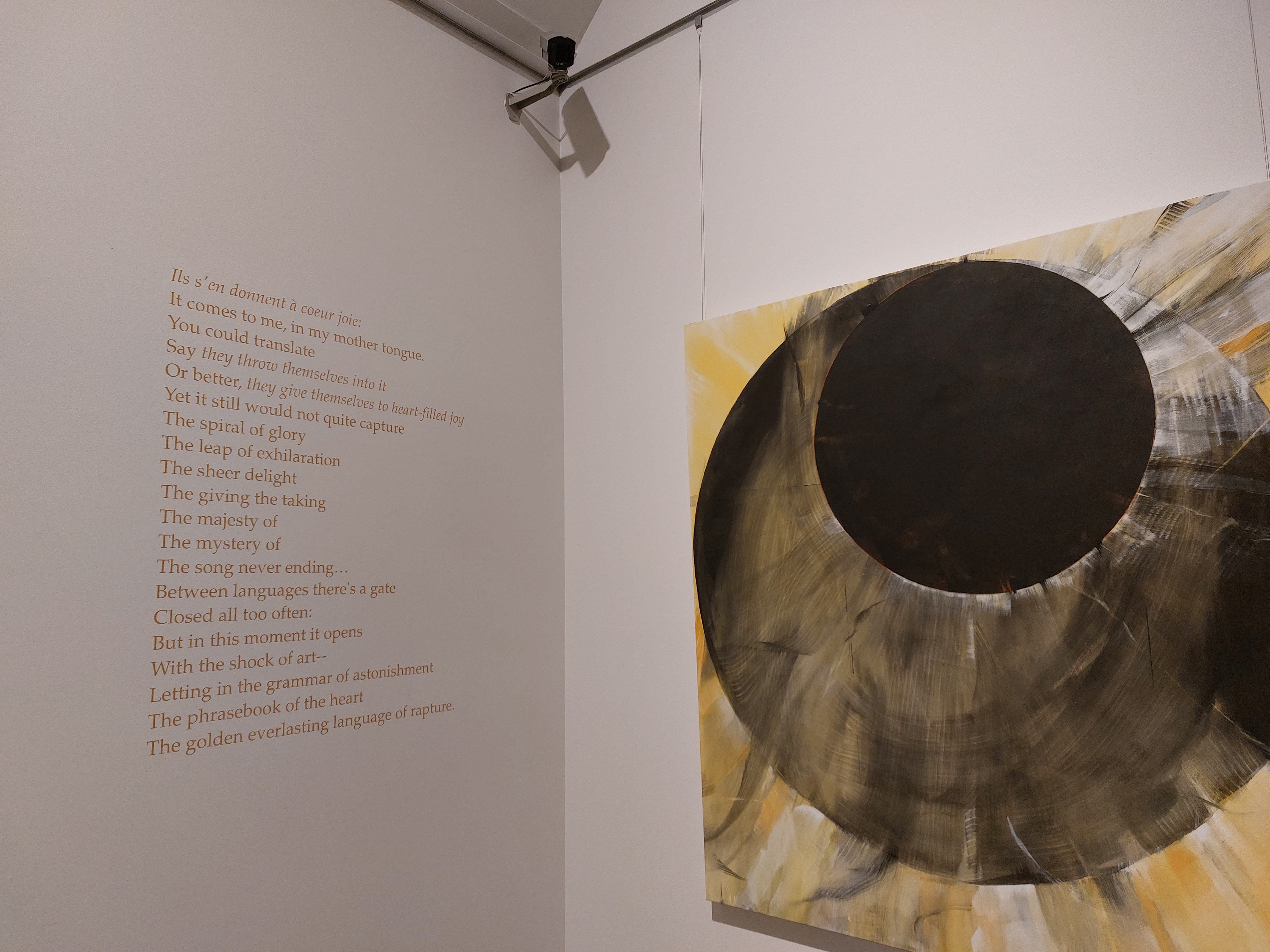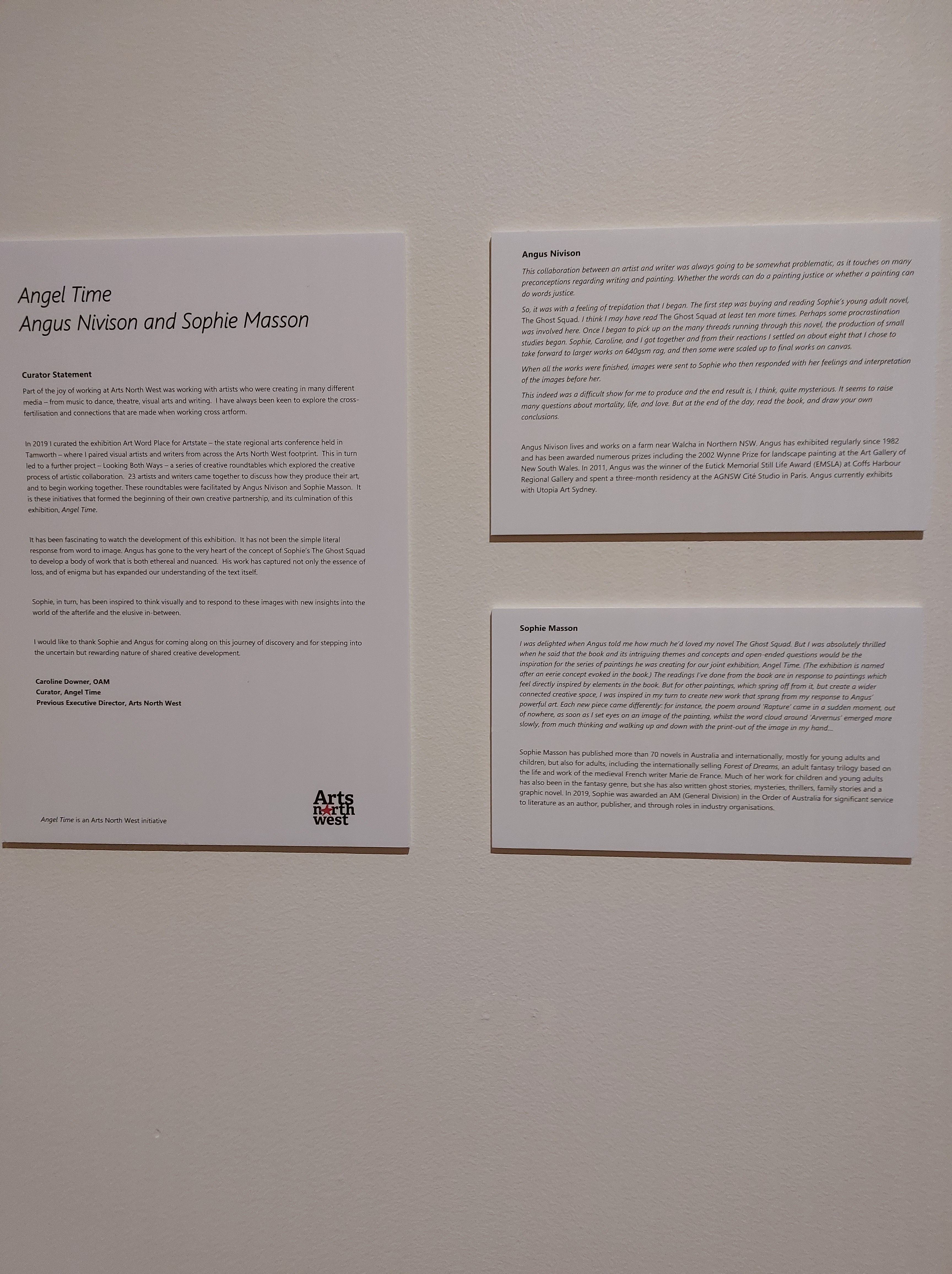 Last night was the opening of my Angel Time exhibition with the wonderful painter Angus Nivison, at the New England Regional Art Museum in Armidale. It was so exciting to see it up: it looks absolutely wonderful, so gorgeously and imaginatively displayed, immersive and extraordinary, my words and Angus’ striking, haunting artworks flowing in and out of each other beautifully. As well as my poems, song lyrics and prose fragment displayed on the walls next to the paintings they are inspired by, there are several audio readings, accessible via QR codes, of extracts from my novel The Ghost Squad which directly inspired others of Angus’ paintings, and also a ‘word cloud’ which is projected onto translucent hangings: looks so spookily effective! There was a big, interested crowd present and lots of great comments–people were really intrigued by it. The exhibition is on till August 28, so lots of opportunities for people to see it! Below are some pics from the exhibition.