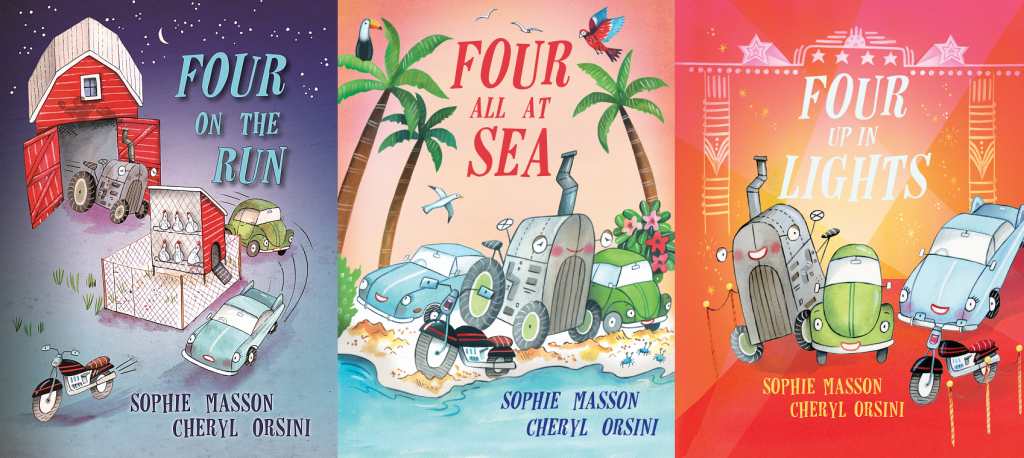 I’m delighted to reveal the gorgeous cover of Four Up In Lights, the third and final in the fun little chapter-book series I’ve created with the wonderful illustrator Cheryl Orsini. The series, which has been very popular with young readers, is about the funny, fast-paced adventures of four friends who just happen to be vintage vehicles–two cars, a motorbike and a tractor–and I’ve really loved writing it, and loved, too, collaborating with Cheryl, who has made our four friends come to such lively, characterful and endearing life! Four Up In Lights will be released in September by Christmas Press, and is a sequel to Four On The Run(2020) and Four All At Sea (2021).