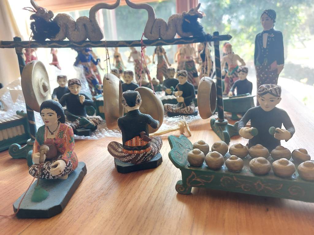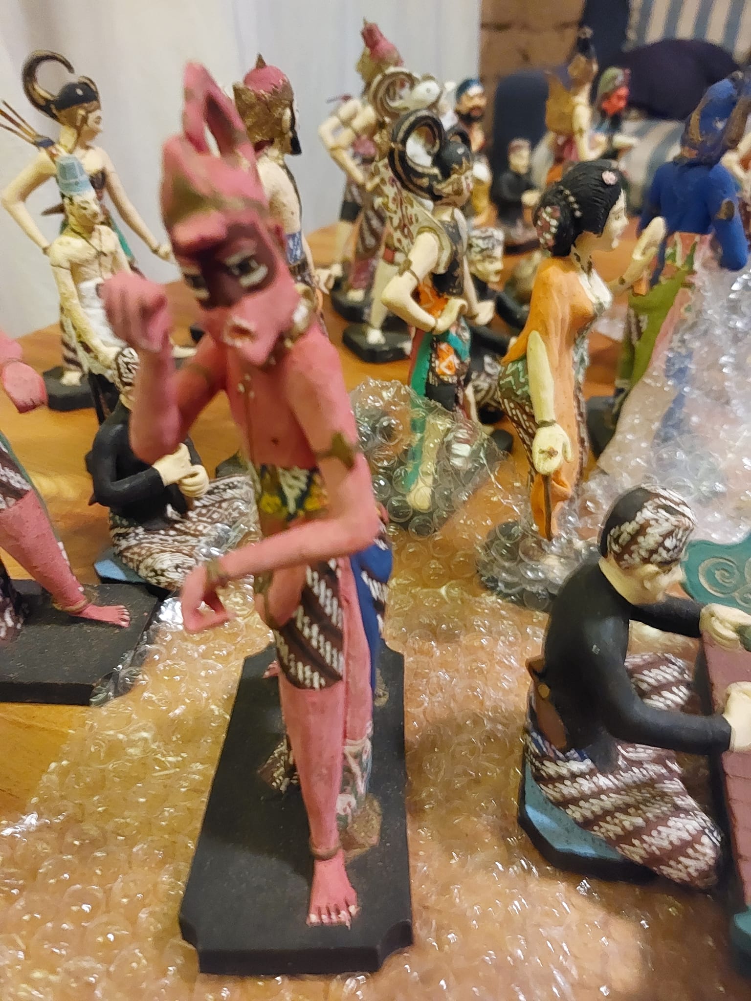 They had already given me one unique treasure: the handwritten script of a particular wayang play, written down by a Javanese dalang(master puppeteer) in Javanese and then translated into modern Indonesian and English(both languages my parents spoke fluently). And now I have another Javanese treasure, gifted by my father and carefully brought here from France by my brother: a totally gorgeous set of exquisitely-painted clay figurines which my parents bought in Yogyakarta many decades ago, depicting a wayang orang performance with a full accompanying gamelan orchestra. They are absolutely unique pieces: I have never seen any other like them–including on the internet 🙂