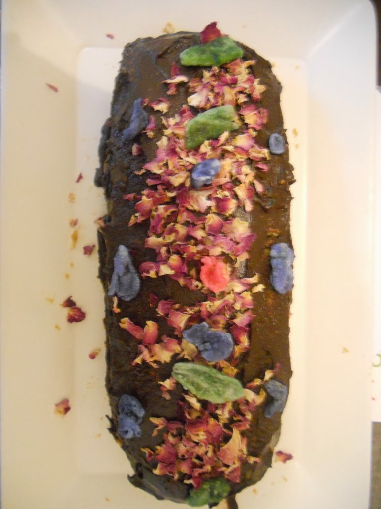 Super easy Bûche de Noël /Christmas log (needs no baking, can be made Christmas Eve). As noted above, this was my mother’s invention, we had it every Christmas when we were kids, and I still make it every Christmas. Ingredients: 1 packet sponge finger biscuits 200 g unsalted butter, melted 1 or 2 eggs(depending on how much mixture you have) half to 3/4 cup hot strong sweet coffee(a good instant coffee works fine) Cooking chocolate, melted with a little cream. Crush all the biscuits, add the hot sweet coffee, the melted butter, and mix well. Add the slightly beaten egg(or two). You need to obtain a good stiff mix that you can easily shape into a log. That’s what you do then–shape it into a log, and then put it in fridge till it is set. Meanwhile melt the chocolate over a low heat with a little cream, stir till all melted and glossy. Spread over the cake, on the top and sides. Put in fridge to set overnight. You can also decorate the top with angelica leaves, almonds, sugar holly, whatever you feel like!
