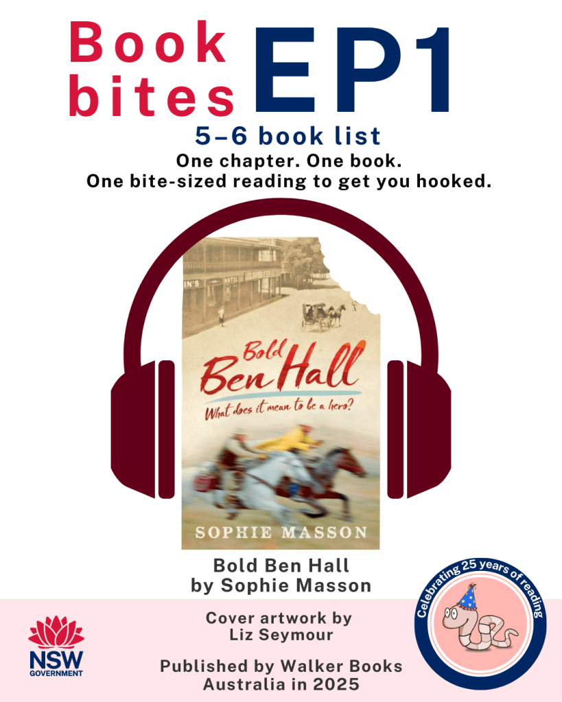 To celebrate the 25th anniversary of PRC, a fabulous new companion initiative is being launched today, the 23rd February, on the same day that the 2026 NSW Premier’s Reading challenge kicks off. It’s a podcast called Book Bites and features authors reading an extract from one of their books listed in PRC. And I am absolutely honoured and delighted that my reading of the first chapter of Bold Ben Hall was chosen to be the launch episode of Book Bites in the Years 5-6 category. It was huge fun to record it and meet the team at the NSW Premier’s Reading Challenge and I am thrilled that it will now be available for listeners to enjoy.