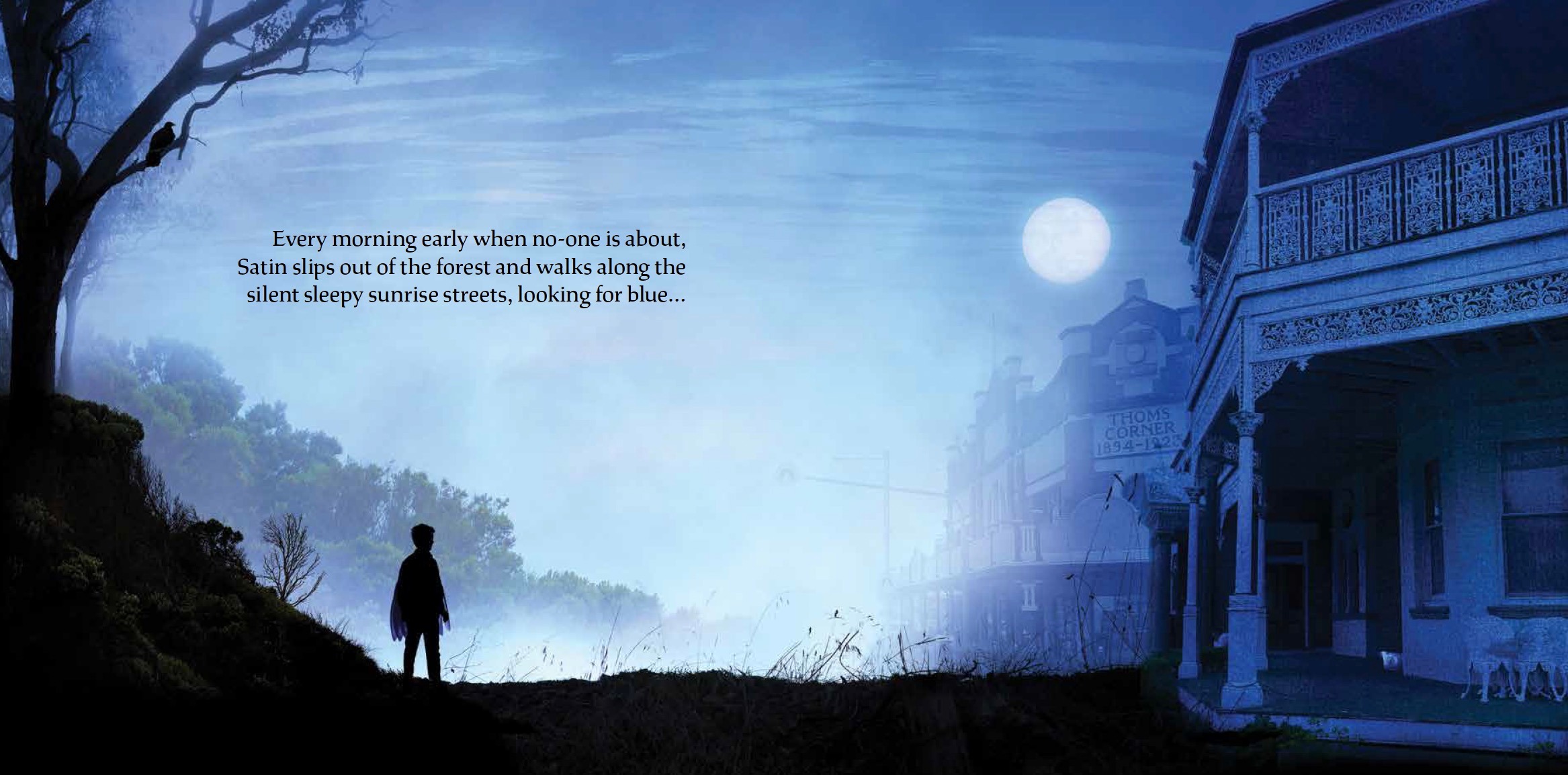 Every morning early, when no-one’s about, Satin slips out of the forest and walks along the sleepy sunrise streets, looking for blue…