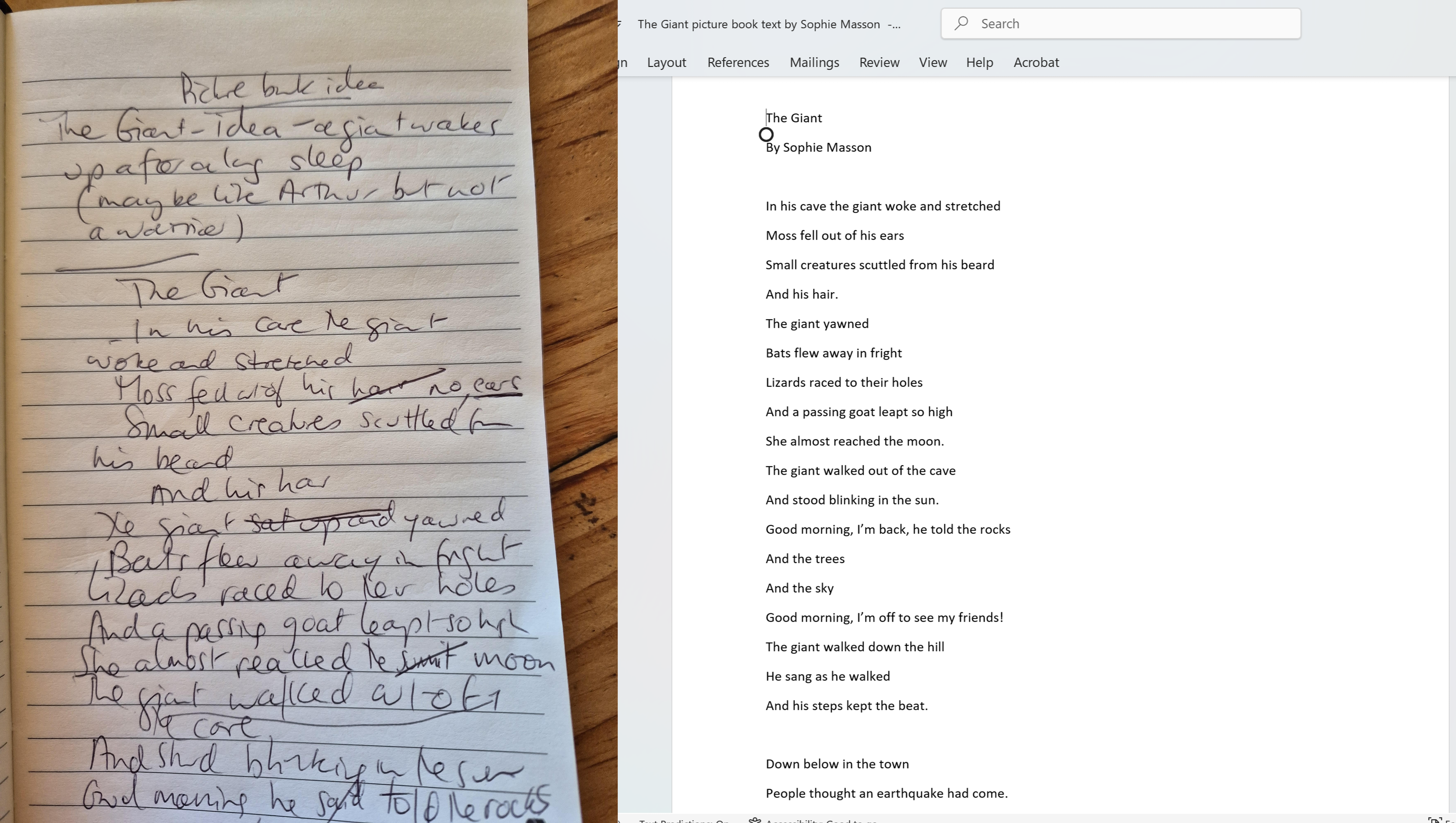 on left, part of the original first draft in my notebook, on right the finished draft on the computer