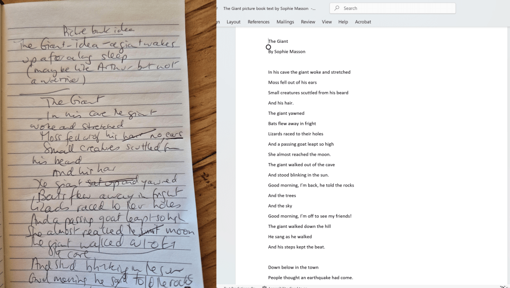 As a child, I had read old stories where great heroes slept for centuries in caves but might wake up one day if they were needed to fight battles. But I knew my giant wasn’t about fighting battles, he was about finding his friends. And I could imagine his excitement as he went out into the sunshine, filled with joy as he thought he could see his friends again. And then his sadness as he realised nobody remembered him…I hurried home then so I could write his story down and find out what happened next to this gentle giant whose tears could make a river rise.