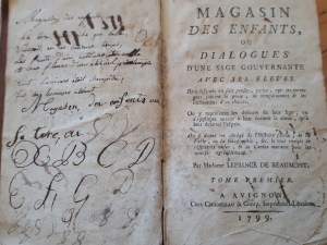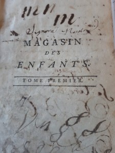 The second book in my collection that offers an intriguing glimpse into past lives through unofficial additions to it is another book from the 18th century, also within the fairytale genre; a 1799 edition of the first volume of Madame Leprince de Beaumont’s Magasin des Enfants (first published in 1756) which contains within it her famous retelling of la Belle et la Bête, or Beauty and the Beast. It’s a fascinating book of course, and there’s a lot to say about the tale itself and how it differs(very positively!) from an earlier version by an earlier fairytale-writer, Madame de Villeneuve, but that’s a story for another day. Today, what I want to note are those unofficial, marginal evocations of a previous reader’s relationship with this particular copy of the book. And it’s a very different story to the other one!