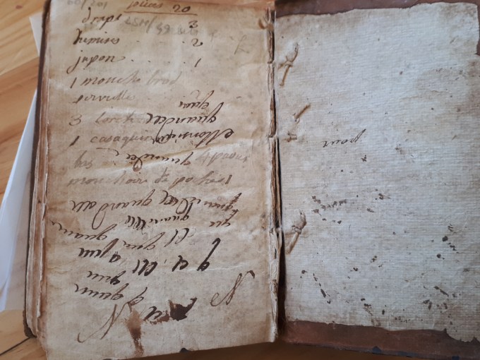 The back flyleaf meanwhile told a different tale. There are some ‘handwriting practice’ scribbles on it but also something quite different: an actual laundy list 🙂 ‘Twenty pieces’ proclaims the heading, which then goes on to list the various articles: draps(sheets) a jupon(petticoat), mouchoirs de poche(pocket handkerchieves), torchons(teatowels) and more. ‘Twenty pieces’ proclaims the heading. The words are in French, in a different, firmer hand to the other, and hints at an adult rather than a child or adolescent. Was it the laundrymaid who wrote those words, or more likely the lady of the house, or perhaps a housekeeper, noting down the articles that had been sent off to the laundry? I don’t know, anymore than I know why you’d use a book as a makeshift aide-memoire, and just once too(the kid scribbling in the book seems more understandable)but here again are glimpses of people from the past, anonymous but whose presences flicker into view, even if briefly, in a rather touching way.