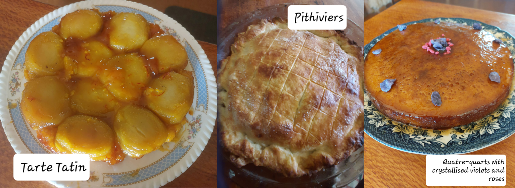 This glorious upside down apple tart was the invention of the Tatin sisters, Caroline and Stéphanie, who had a restaurant in the Sologne region at the end of the 19th century. The legend goes that it was as a result of a mistake by Stéphanie—burning the caramelised apples for a ‘normal’ tart, then hastily putting the pastry on top to hide it—that the famous Tatin tart was born. (Although in my opinion that’s hard to believe!) Anyway, Sylvie told us that the ‘mistake’ proved so delicious that people came from far and wide to eat the Tatin tart—and the sisters became famous too. They were even invited to the house in Giverny of the great Impressionist painter Claude Monet, who was a great gourmet, and they wrote down their own recipe for him—or rather so that his cook could make it even after they’d gone home! I love that image—the great artist and the great cooks, bonding over a buttery caramelised upside down apple tart! Anyway, okay, so here’s how Sylvie showed us how to make it(it’s her adapted version): Firstly, take a deep round metal tin that can go on the hot plate as well as in the oven. That’s because the apples will be cooked in it first before the pastry goes on top. (Sylvie says you can even use a cast iron frying pan, as it can go in the oven, if you take off the handle) Make the pastry in the same way as for the Pithiviers pie, and set aside to rest in the fridge. Meanwhile peel, core and cut two-three crisp apples(depends on their size) into segments(either halves or quarters) and put them upside down in the tin on the stove, with a chunk of unsalted butter(say around 60-80 g)and around 90 g of castor sugar. Cook over a moderate to high heat till the apples are caramelised and golden and soft(but not mushy!) Watch carefully and stir frequently as you don’t want it to burn(no matter what Stéphanie did 😊) Take off the stove, roll out the pastry, put it on top of the apples and pop straight away into a pre-heated oven(180 degrees C) To serve, turn tin upside down onto a plate so the beautiful sticky golden apples appear on top–or you can serve as is in the tin, with the pastry on top. Up to you (though I think turning it upside down looks more spectacular!) Serve with crème Chantilly (ie whipped cream, with a little sugar and a flavouring such as vanilla. And by the way use only pure cream, not thickened cream)