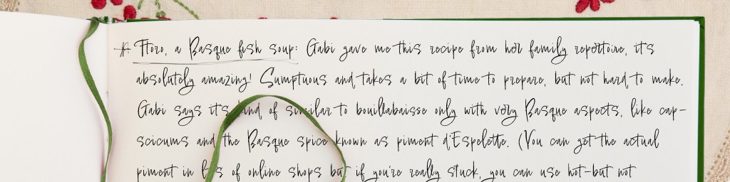 Ttoro, a Basque fish soup: Gabi gave me this recipe from her family repertoire, it’s absolutely amazing! Sumptuous and takes a bit of time to prepare, but not hard to make. Gabi says it’s kind of similar to bouillabaisse only with very Basque aspects, like capscicums and the Basque spice known as piment d’Espelette. (You can get the actual piment in lots of online shops but if you’re really stuck, you can use hot—but not smoked—paprika). By the way, ‘ttoro’ is pronounced ‘tioro’.
