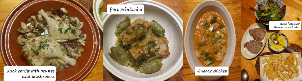 Confit de canard aux prunes: Something that comes out of south-west France, where Sylvie originally comes from: it’s a great and easy way to cook duck confit, accompanied by a delicious prune sauce. First you cook the duck confit in its own juices in a frying pan. As confit is already-cooked you only have to cook it for say 15-20 minutes. Add salt and pepper, sliced onions, then take some good-quality plump prunes, chop them and add to the pan along with a dash of cognac or Armagnac (or other brandy) and cook for another 5 mins more. Serve in its sauce, with bread and a side salad. Deliciously simple! You can vary it by adding mushrooms to the pan as well.