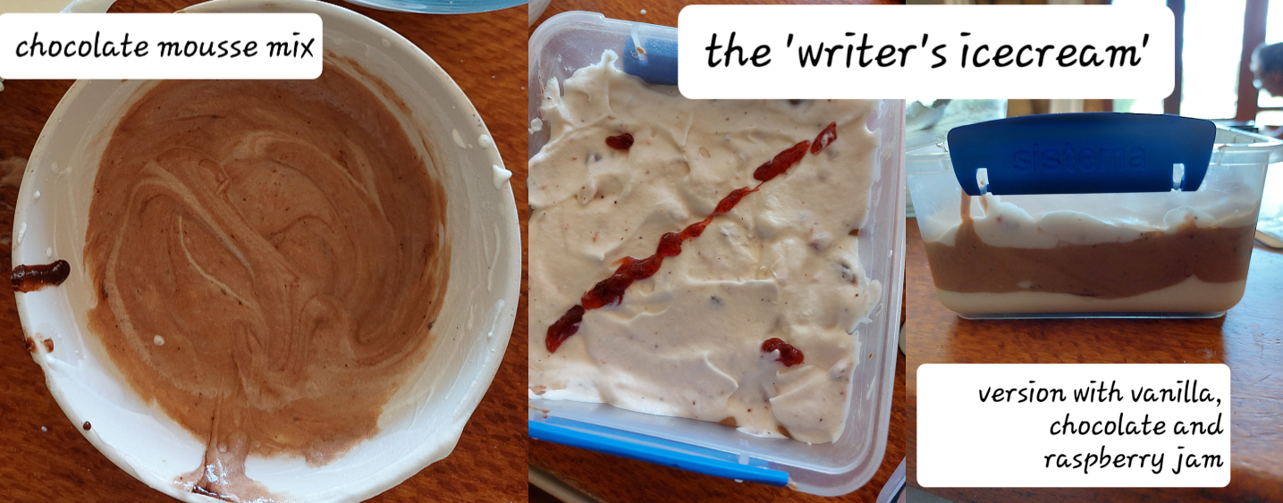 The Writer’s Icecream: this is my name for an icecream recipe that Sylvie told us she picked up from a writer she met at a book launch once. It’s dead simple. So you take two eggs, separate them, and beat the whites with sugar(about four tablespoons) till they are light and form in stiff peaks, like for meringue. You then whip up some cream (pure whipping cream, not thickened or double cream) with a bit of sugar (say two tablespoons), fold the egg white mix into the whipped cream, add a couple of drops of vanilla essence, or melted chocolate, or coffee, or a mix of things–as long as you don’t add anything water-based to it, or fresh fruit—though jam is okay. You can even make layered ‘Neapolitan’ style icecream with one layer of vanilla icecream, one with melted chocolate, and one with strawberry or raspberry jam. Then you put your mixture in the freezer for several hours or preferably overnight., And there! Perfect icecream, that never fails and never crystallises…as long as you remember the rule about no water-based additions or fresh fruit 🙂 For a variant called a ‘parfait’ you can also beat up the egg yolks with sugar and add them to the egg white mix and cream before putting the whole thing in the freezer: that makes a yellow, very creamy kind of icecream.