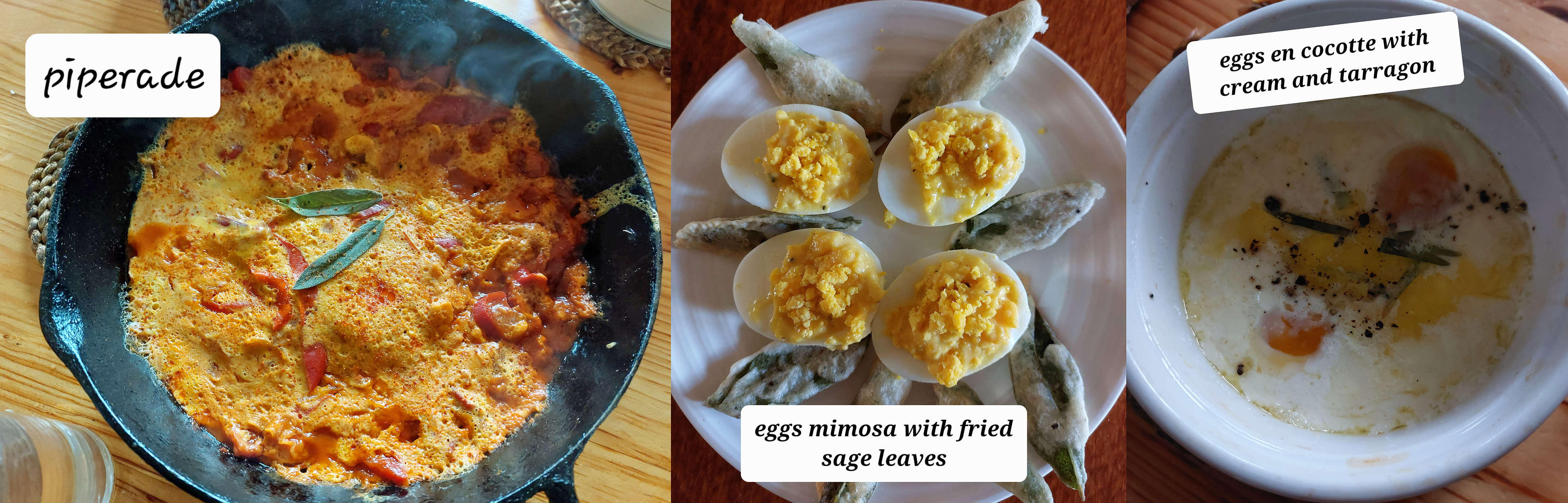Oeufs en cocotte, a la crème et l’estragon: These are amazingly easy and delicious baked eggs with cream and tarragon, and were made by Sylvie and Damien the first day we were at the School.