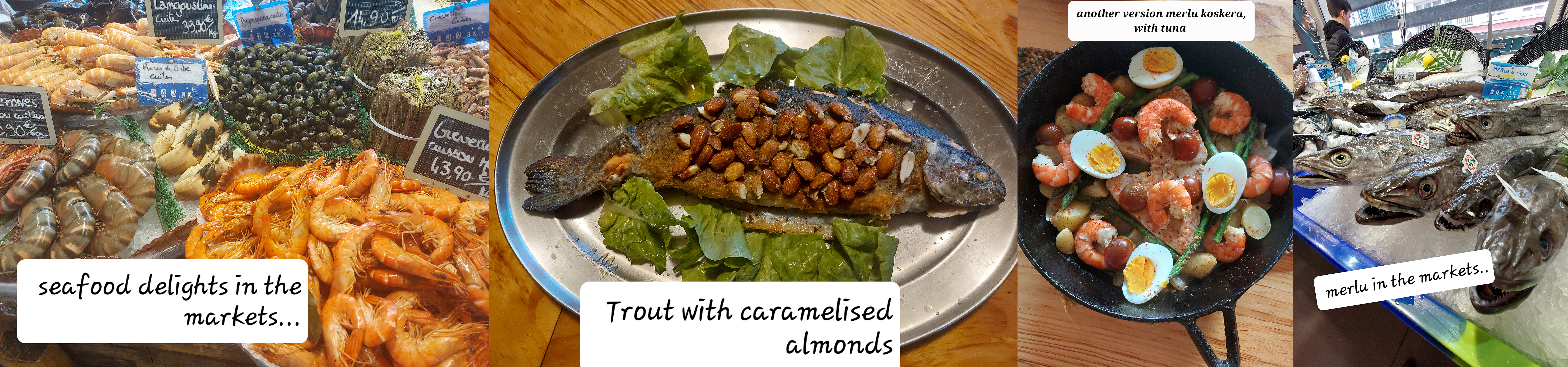I’ve already written down Gabi’s Basque soup, but here’s a quick description of another fish and seafood dish from that region, which she and Pete made for that final group lunch, only it’s more of a one-pot stew. It’s called merlu koskera. So for 2 people, she says, you take a couple of pieces of white fish (the original recipe is for cod or hake but you can also use snapper or other sorts of dense-fleshed white fish and in fact you can also use other dense-fleshed fish, such as tuna). You take steamed asparagus(the green sort, haha), just-cooked peas or broad beans or spinach or whatever else you have to hand. You take cooked mussels or prawns or whatever you’d like in terms of seafood, plus a couple of hard-boiled eggs, and in a big pan, you put in some olive oil, put in the fish, fry on both sides, then add the vegs, add some seafood/fish stock to make it bubble, add salt and piment d’Espelette(yes, that again, you can’t get away from it, in Basque cooking) simmer gently, add the seafood you want to add, simmer again, just a few minutes. And serve with plain boiled rice or bread. It’s a spring dish so includes spring vegs, but I don’t see why you can’t make it with other vegs in other seasons.