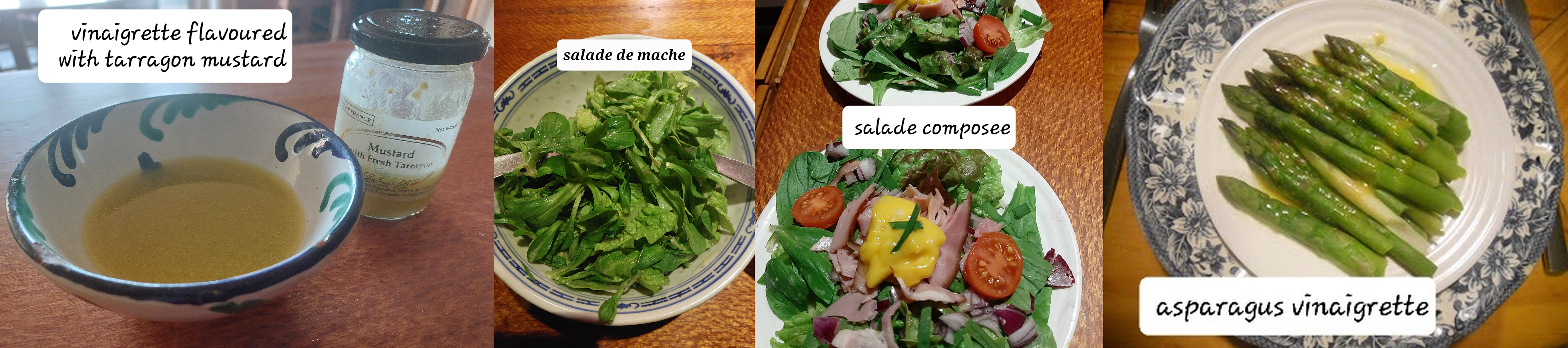 Salads and cold vegs: Before I forget, here’s the recipe for vinaigrette, that lovely tangy dressing the French use in pretty much all salads, from the most basic tossing of lettuce to the most elaborate mix. The basic one is just virgin olive oil mixed with red or white wine vinegar, salt, pepper, and a little mustard(you can use basic Dijon mustard, or those with added herbs, wine, etc). Obviously you have more oil than vinegar 😊 it’s like 2 or 3 parts oil with one part vinegar. It’s got to taste tangy, not oily though. Sylvie also includes a little grated garlic and chopped tarragon in hers, when tarragon is in season that is. Otherwise she uses tarragon mustard. Salads by the way are an indispensable part of the French meal, from the simplest green salad(which usually would be served after the main course, as a kind of ‘palate cleanser’ between the main course and the cheese and/or dessert) to elaborate ones which might be served as an entrée or as a single lunch dish. But there’s also other cold veg dishes with vinaigrette which are popular.